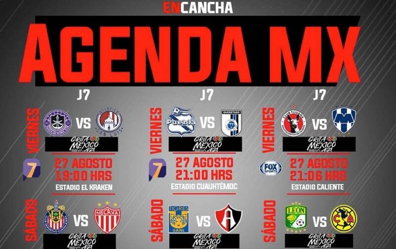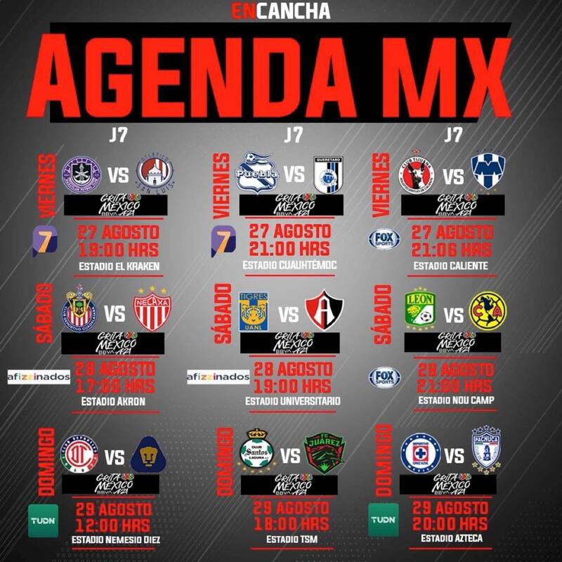 La Bombonera será en el escenario para que Pumas intente buscar su segunda victoria al hilo, siendo que visitará al Toluca al mediodía del domingo 29 de agosto. Por la tarde, Santos Laguna se enfrentará al FC Juárez de Ricardo Ferretti, el cual sigue sin poder sumar de a tres unidades en su nueva travesía. Finalmente, la séptima fecha concluirá con el Cruz Azul ante Pachuca que dará inicio a las 20:00 horas en el Estadio Azteca.
