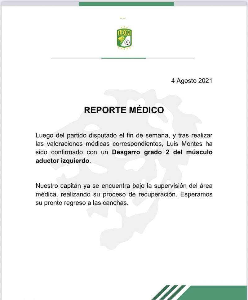 El Club León emitió el comunicado oficial de lo que sufrió el 'Chapito'. "Luego del partido disputado el fin de semana y tras realizar las valoraciones médicas correspondientes, Luis Montes ha sido confirmado con un desgarro grado 2 del muslo aductor izquierdo", se lee en el reporte médico.