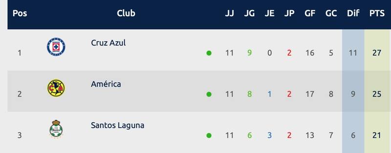 Hasta el momento, el Azul acumula 12 puntos de local y 15 de visita, a diferencia del América que ha demostrado ser más eficiente en el Azteca y de sus 25 unidades solo siete las ha conseguido fuera, mismo caso con Santos que de sus 21 puntos solo cinco los ha logrado de visita. Además de La Máquina, el único equipo de la Liga que hasta el momento tiene números más altos de visita que de local, son las Chivas de Vucetich, que no han logrado enderezar el camino en el torneo y en el lugar 13 han logrado 12 puntos, de los cuales siete han sido conseguidos de visitante.