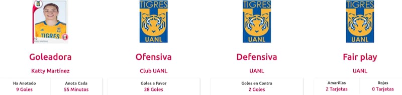 Tigres registra a la Goleadora del Torneo, Katty Martínez con 9 tantos; Mejor Ofensiva con 28 goles a favor en lo que va del torneo; Mejor Defensiva teniendo solamente 2 goles en contra y también, el mejor Fair Play sumando solamente 2 tarjetas amarillas.