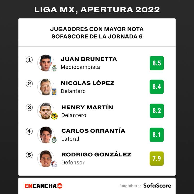 Aunque la jornada 6 llegó después de la primera fecha doble del certamen, entre los mejores partidos estuvieron el de Santos contra Atlas y el de León contra América. Resultado de esto fue que tres jugadores de estos encuentros aparecieron entre los mejores calificados por su desempeño según Sofascore.