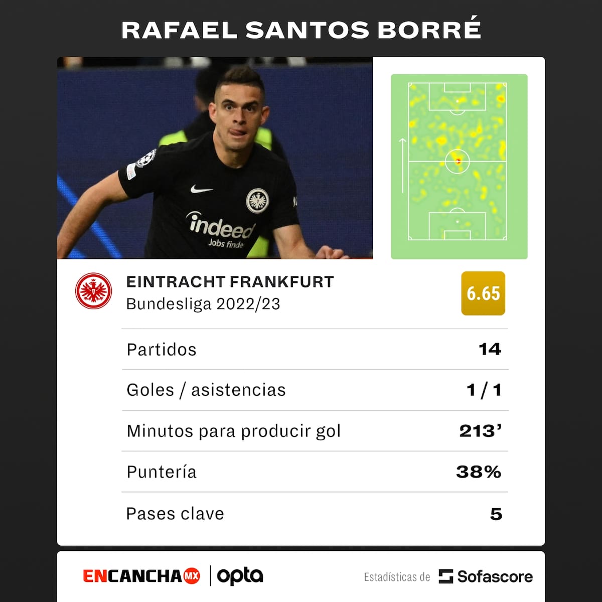 Sin embargo, los números proporcionados por SofaScore no son nada alentadores para confirmar el valor de mercado del Santos Borré, quien en esta temporada de la Bundesliga ha jugado un total de 14 encuentros y marcado un solo tanto, además de aportar una asistencia.