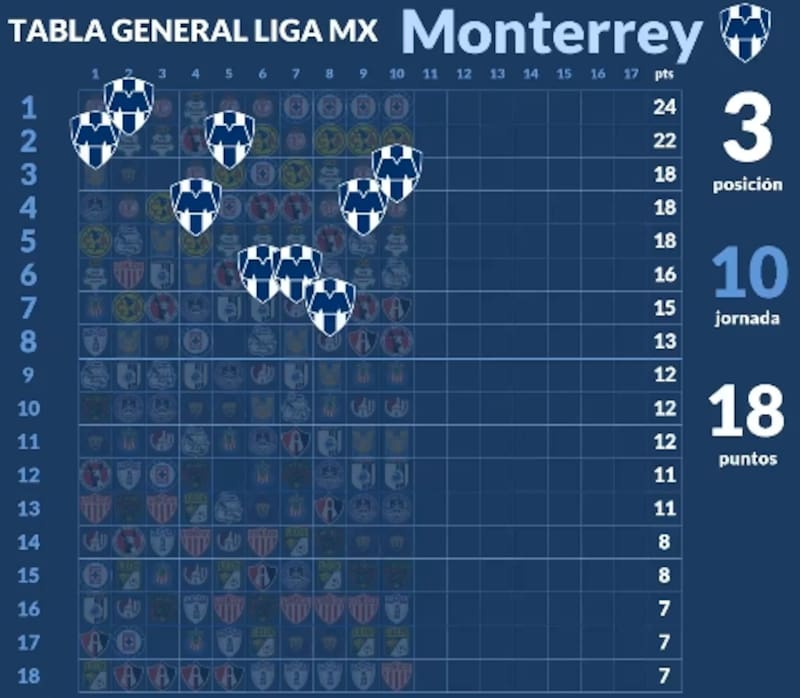 La última derrota de los "Rayados" fue en contra de Santos en la Jornada 6 por 1-0. A partir de ahí, Monterrey no conoce la caídas tras haber empatado dos juegos y ganado los otros dos, el equipo comandado por el "Vasco" Aguirre buscará consolidarse en la tercera posición después de jugar su partido pendiente ante el actual campeón, León.