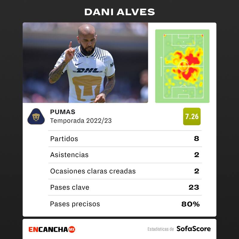 Dani Alves ha sido el blanco de críticas de todo tipo desde su llegada a los Pumas para este Apertura 2022, sin embargo, las estadísticas que nos trae SofaScore lo respaldan como uno de los mejores creativos de la Liga MX.