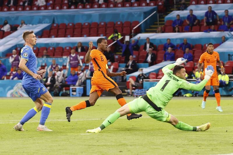 Fue en una contra por la derecha con un centro raso de Denzel Dumfries. Bushchan logró despejar en primera instancia pero dejó la pelota a merced de Georginio Wijnaldum, quien desde la línea del área aprovechó el rechace para hacer gol en el undécimo disparo de los neerlandeses. Con el marcador a favor y el calor del público local en el Johan Cruyff de Ámsterdam, la antigua Holanda tardó sólo seis minutos en hacer el segundo, factura de Wout Weghorst que fusiló la portería de los de Andréi Shevchenko.