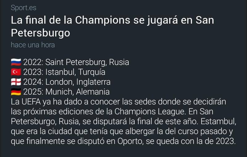 Por otro lado, la final de la Liga de Campeones de 2023, que originalmente se llevaría a cabo en Múnich, Alemania, se recorrió hasta el año 2025. El estadio de Wembley de Inglaterra, será escenario de la final en el 2024. Mientras que Bilbao recibirá las finales de la Liga de Campeones Femenina en 2024 y de la Liga Europa en 2025.