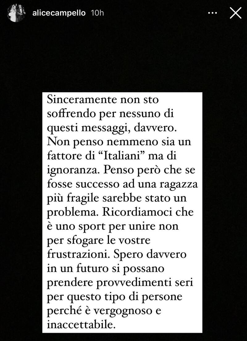 Alice Campello-Morata arrancó la serie de historias que subió, explicando: "Sinceramente no estoy sufriendo por ninguno de estos mensajes, de verdad. No creo que dependa del hecho de que son 'italianos', sino son ignorantes… Realmente espero que en el futuro se puedan tomar medidas serias para este tipo de personas porque es vergonzoso e inaceptable".