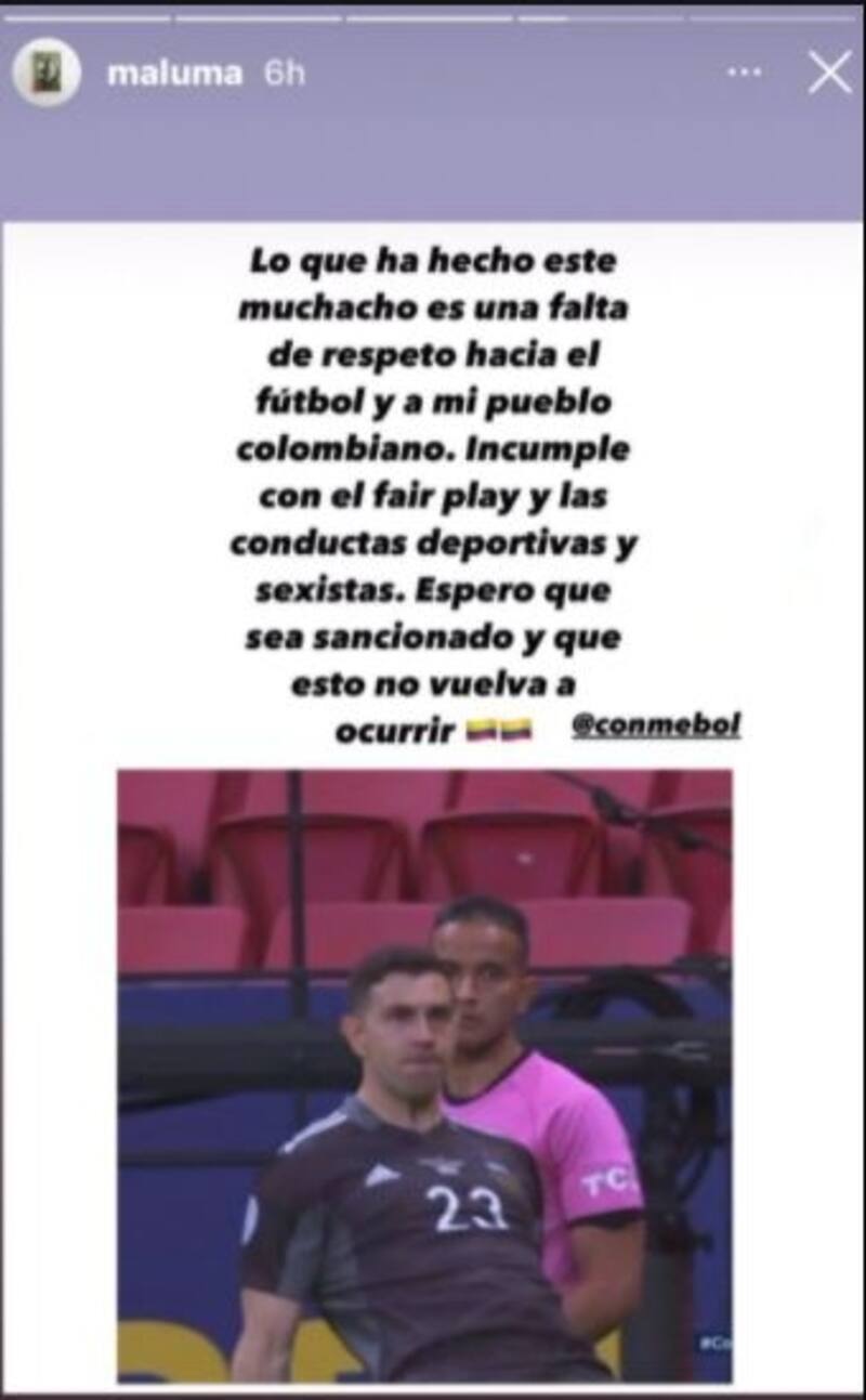 "Lo que ha hecho este muchacho es una falta de respeto hacia el futbol y a mi pueblo colombiano. Incumple con el fair play y las conductas deportivas y sexistas. Espero que sea sancionado y que esto vuelva a ocurrir", se lee en la publicación, misma que borró de sus redes sociales.