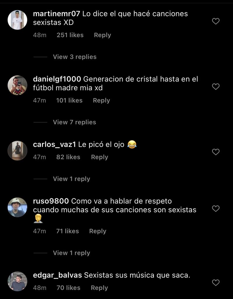 Mediante su cuenta de Instagram, el cantante subió una historia con la foto de Martínez y un pequeño texto donde calificaba estas acciones como sexistas y antideportivas, además, etiquetó en dicha historia a la cuenta oficial de la Conmebol.