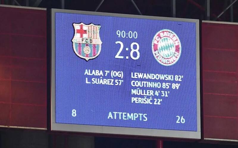 Momento que nunca se borrará de la memoria de los aficionados azulgranas, ni mucho menos de los seguidores del Bayern, pues en este tremendo partido hubo un festival de goles en contra del Barcelona. 8-2 fue el marcador que se tatuaría en la mente de todo fan del fútbol. Con goles de Müller al 4' y 31', Perisic al 21', Gnabry marcó al minuto 27'. Para el segundo tiempo, la fiesta continuó en ventaja para los de Múnich, Kimmich anotó al 63', Lewandowski no pudo quedarse sin su gol al 82' y Coutinho hizo un doblete espectacular al 85' y 89'.