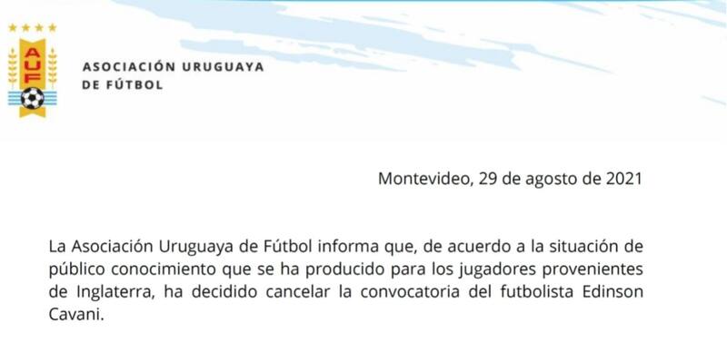 La Premier League decidió de forma unánime no liberar a sus jugadores ni permitirlos viajar para evitar los contagios del virus, lo que inmediatamente encendió alarmas en las diversas selecciones que tienen jugadores en Europa. A través de un comunicado, la Asociación Uruguaya de Fútbol (AUF) anunció que no podrán contar con Edinson Cavani, jugador del Manchester United.