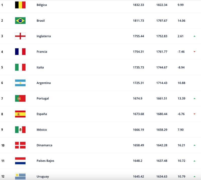 Por el otro lado, Bélgica y Brasil continúan al frente de la clasificación mundial de la FIFA de este mes en sus respectivas regiones, dentro de la región de la UEFA, lo que destacó fue el acceso al podio de Inglaterra en este nuevo Ranking de la FIFA, donde los ingleses dejan por debajo al campeón del mundo, Francia.