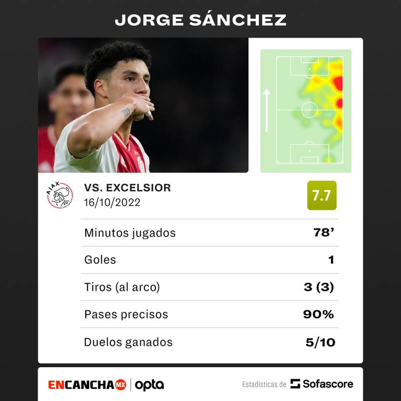Por su parte, Jorge Sácnhez se sacó la espina del mal partido que tuvo en la Champions League y ahora en la Eredivisie se encargó de marcar un gol en la goleada del Ajax al Excelsior con un marcador de 7-1. En este encuentro obtuvo una calificación de 7.7, con 3 tiros a puerta, 90% de pases precisos y con 5 de 10 duelos ganados en defensa.