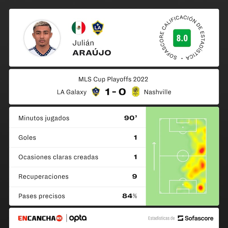 Julián Araujo fue el encargado de marcar en el duelo del Galaxy ante Nashville, dándole la victoria a su equipo. Recibió una calificación de 8, con 9 recuperaciones y un 84% de pases precisos.