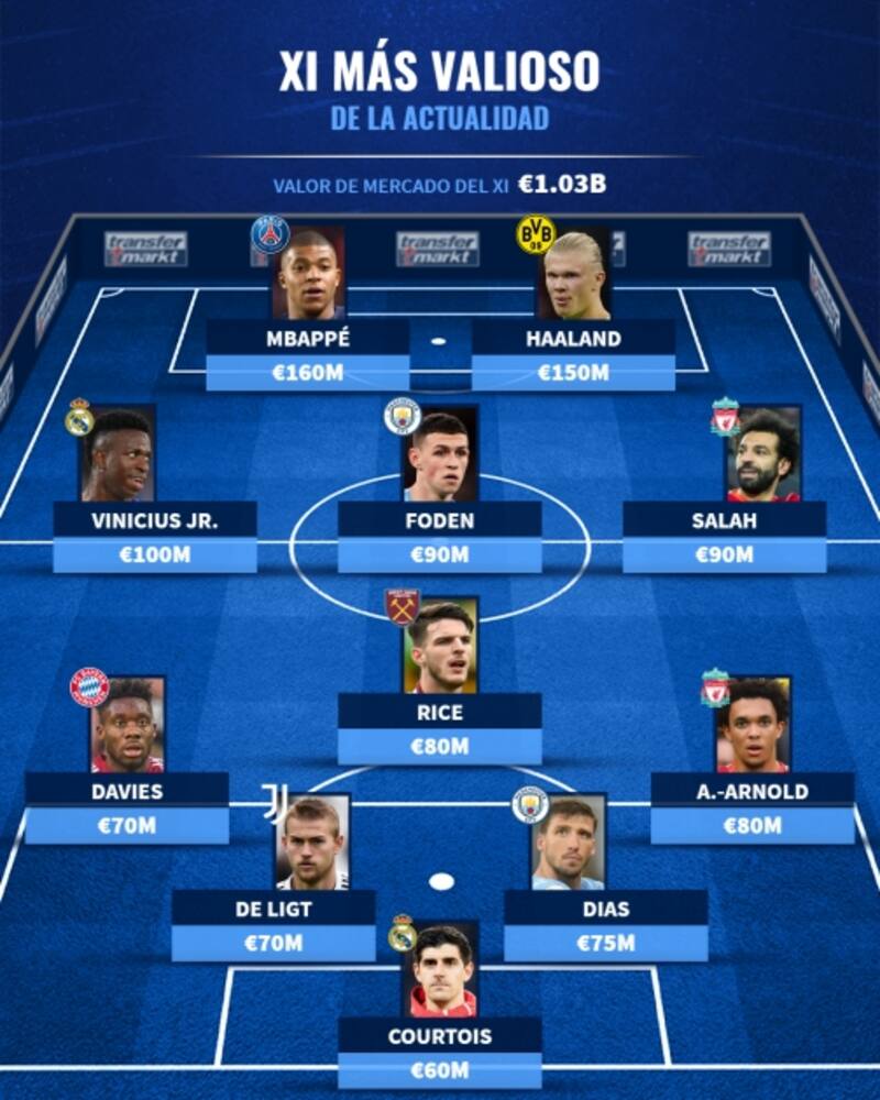 Actualmente, Mbappé y Haaland son los futbolistas más valiosos del mundo, con 160 mill. de € y 150 mill. €, respectivamente, producto de los grandes contratos con sus clubes (PSG y Manchester City).