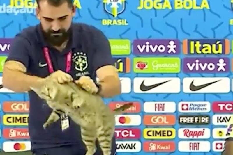 La Selección de Brasil se medirá ante Croacia en los cuartos de final del Mundial de Qatar 2022 y previo a este encuentro, Vinicius Jr y el jefe de prensa del equipo atendieron a los medios de comunicación, pero los reflectores se lo llevó el encargado de los medios cuando un gato apareció en la mesa donde estaban los micrófonos y de inmediato se acercó a acariciarlo, pero de un segundo a otro lo tomó por el cuero y lo dejó caer a la altura de la mesa, dejando a todos atónitos.