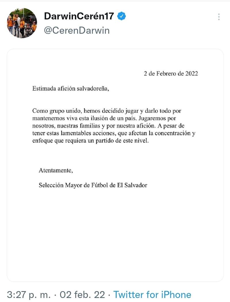 Sin embargo, unos minutos después de darse a conocer este comunicado, los mismos jugadores salvadoreños indicaron que si disputarán este partido del Octagonal Final rumbo a la Copa del Mundo de Qatar 2022, pero solo lo hacen por ellos mismos, por sus familias y aficionados, puesto que no cuentan con el apoyo de su federación.