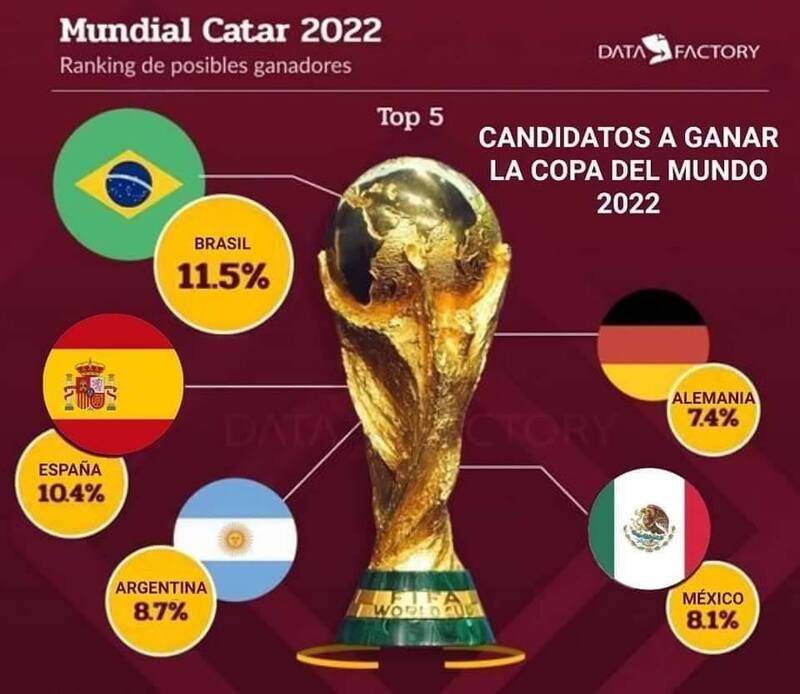 De acuerdo con una estadística realizada por Data Factory, la Selección de México tendría oportunidades de poder conseguir su primera Copa del Mundo en Qatar 2022 según los números del ranking de la FIFA y otras probabilidades. Estaría dentro de las 5 principales naciones en quedarse con el trofeo más importante del planeta.