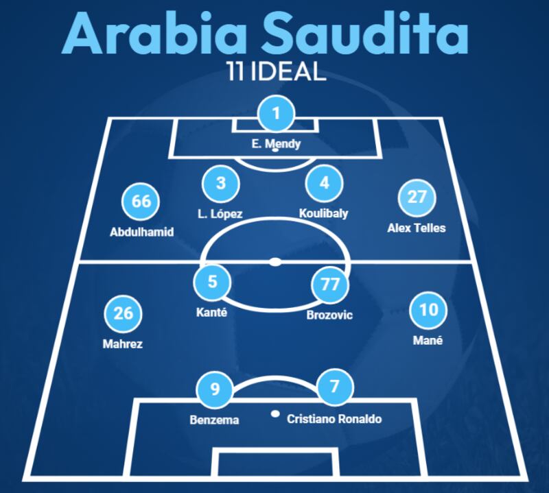 La portería quedaría resguardada por Édouard Mendy y la línea de cuatro del fondo conformada por Alex Telles, Kalidou Koulibaly, Lisandro López y Saud Abdulhamid. En el mediocampo N’Golo Kanté junto a Marcelo Brozovic, para dejar en delantera a cuatro cracks: Sadio Mané y Riyad Mahrez por los costados y Cristiano Ronaldo junto a Karim Benzema en el centro del ataque.
