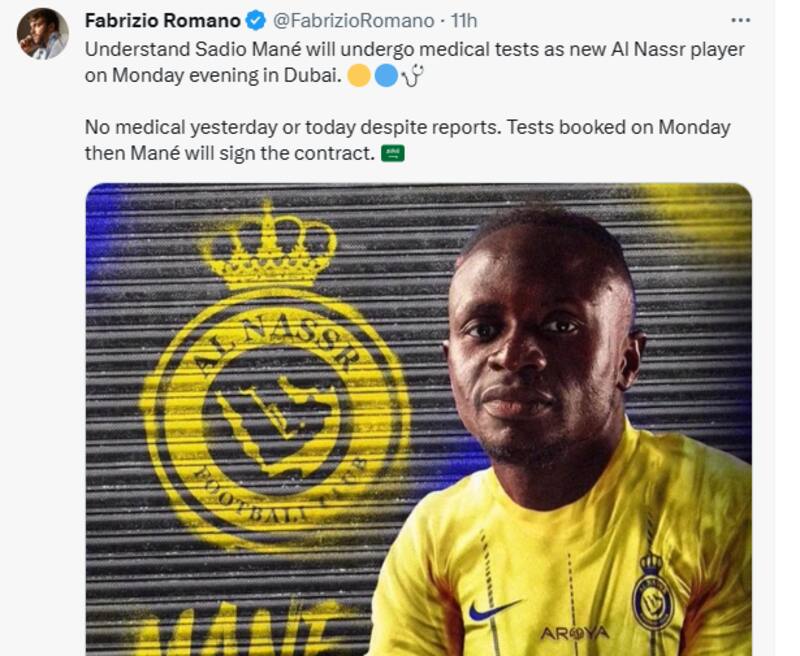 Sadio Mané se someterá a exámenes médicos como nuevo jugador de Al Nassr el lunes por la noche en Dubai. Pruebas reservadas el lunes y luego Mané firmará el contrato”, escribió en su cuenta de Twitter el reconocido periodista.