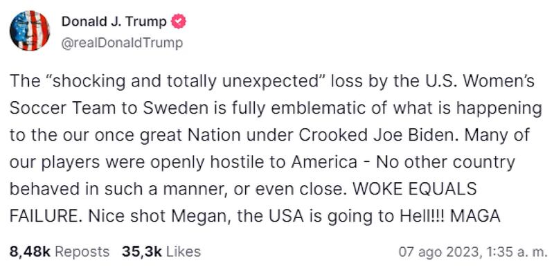 “Buen tiro, Megan. ¡Estados Unidos se va al infierno!”, escribió el exmandatario en Twitter, justo después de que se concretara la eliminación de Estados Unidos en los Octavos de Final del Mundial Femenino.