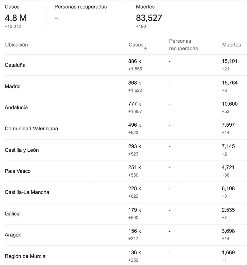Según Our World in Data, España ha alcanzado más de 4 millones de casos positivos de covid19 hasta el día de hoy, con un saldo de 83, 527 muertos. La ciudad de Madrid es una de las ciudades con más casos de coronavirus, teniendo más de 800 mil contagiados.