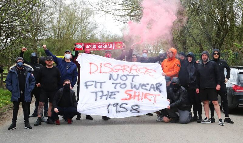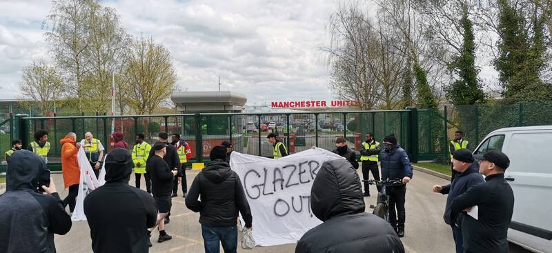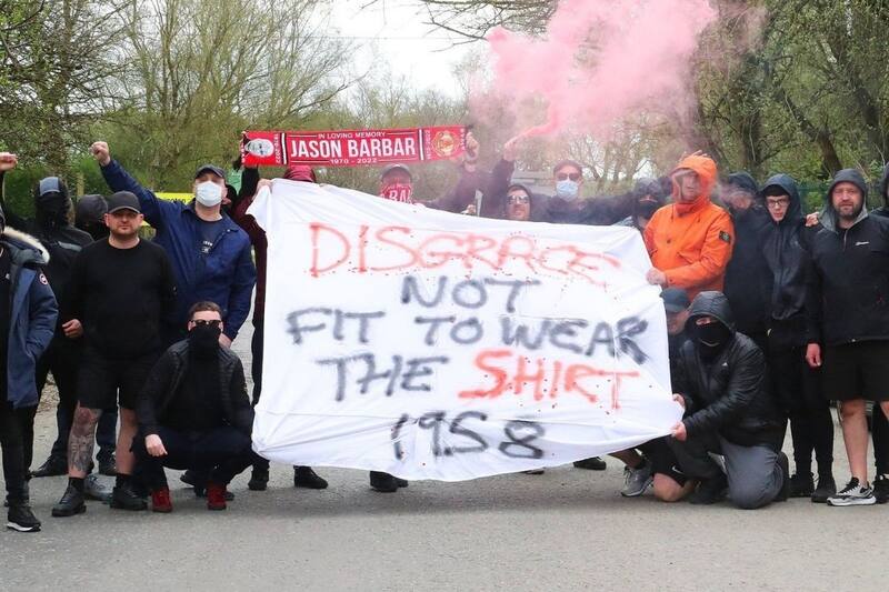 Un grupo de personas se dio cita en los alrededores del campo de entrenamiento de Carrington para alzar la voz con una pancarta que decía: "no están en condiciones de usar la camiseta", por su traducción al español.
