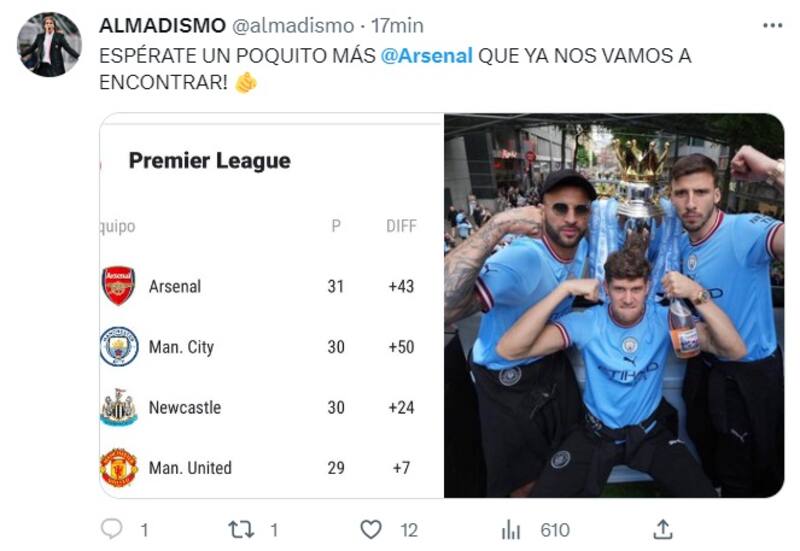 El empate deja al Arsenal con 74 puntos como líder de la tabla, pero los “Ciudadanos” son escoltas con 70 unidades, un duelo menos y el partido pendiente entre ambos equipos, que se disputará el próximo miércoles 26 de abril, en el Etihad Stadium.