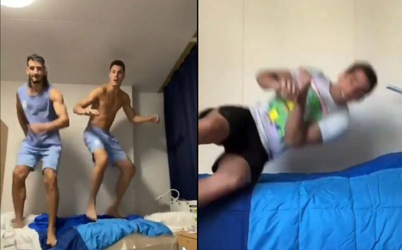 Uno de los primeros en medir la resistencia de las camas fue Rhys Mcclenaghan, gimnasta de Irlanda del Norte, quien subió un video a su cuenta de Twitter, en el que se le puede ver saltando con fuerza sobre su catre, desafiando al menos la idea de que no aguantaría el peso de dos personas.