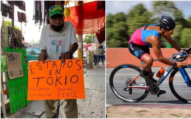 En las redes sociales se ha vuelto viral la imagen de Don Hermilio Pérez, abuelo del triatleta mexicano, Irving Pérez, debido a que tiene un puesto ambulante donde vende productos de piel y lo ha decorado con mensajes de apoyo para su nieto.