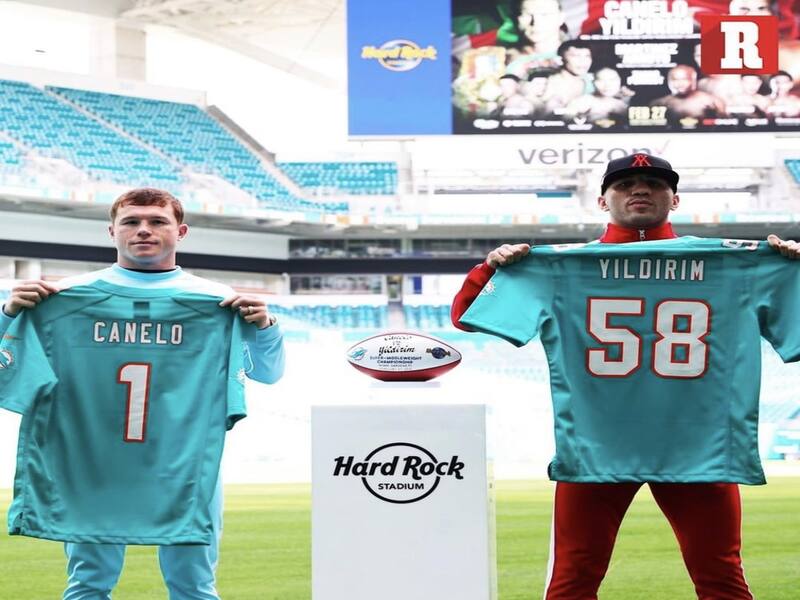 Matchroomboxing compartió en sus redes sociales una foto de los dos boxeadores que se enfrentaran el próximo sábado, posando con el jersey de los Delfines de Miami: "Canelo" porta el dorsal 1 y Yildirim el 58.