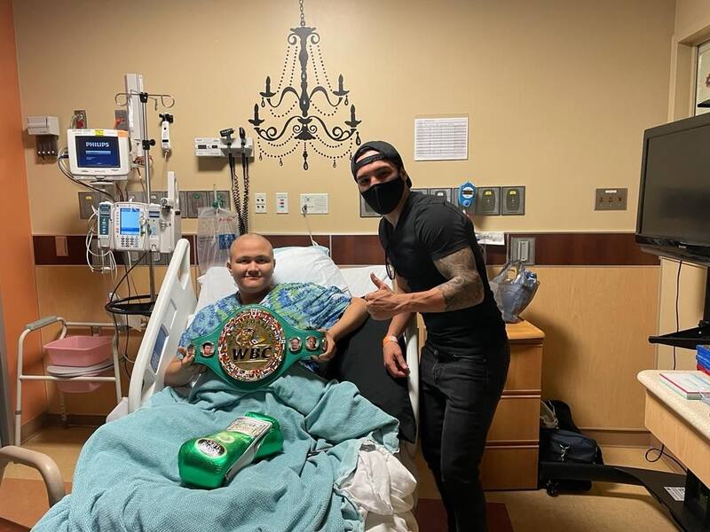 El joven Carlos Molina estuvo presente en las primeras filas para ver a Óscar retener su título, ahora Valdez le ha devuelto la visita en un hospital de Tucson, Arizona, previo a que ingresara nuevamente al quirófano, para entregarle unos guantes y mostrarle el cinturón de la disisión superpluma verde y oro.