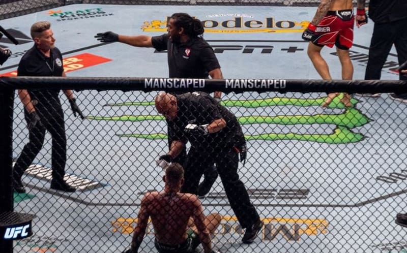 The Notorious puso su pie en un intercambio de golpes, pero piso mal y esta situación provocó una grave lesión en su tobillo, por lo que los médicos y el referee el encuentro se dieron cuenta y tras ser evaluado se confirmó que no podría seguir, por lo que se dio por terminado el evento.