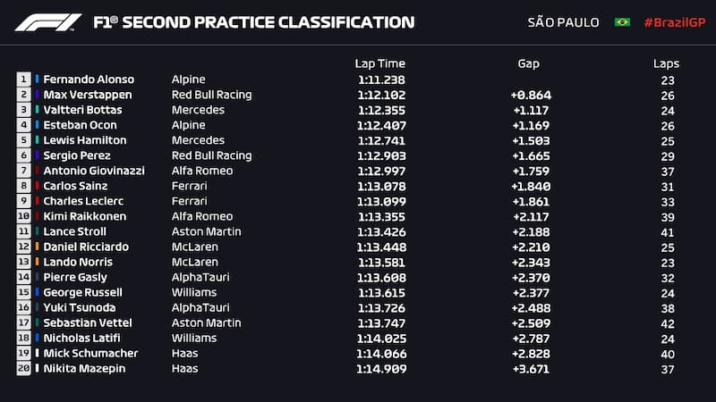 El piloto español destacó en el circuito de Interlagos marcando el mejor tiempo, dejando en el cronómetro 1:11.238, mientras que Verstappen quedó detrás por 8 milésimas de segundo. Asimismo, le siguió Valtteri Bottas de Mercedes y Estaban Ocon de Alpine.