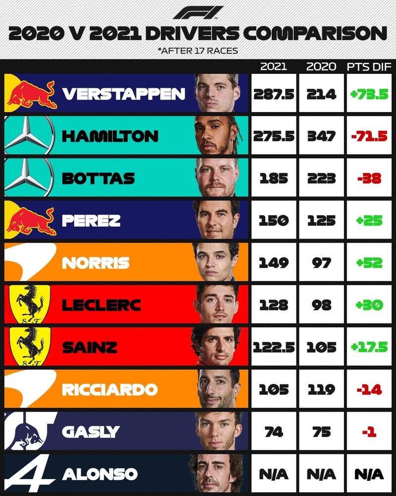 En esta imagen se puede ver que Checo Pérez tiene 25 puntos más en esta temporada con Red Bull, que en la pasada con Racing Point tras 17 carreras disputadas, demostrando que su cambio de escudería le benefició al nacido en Jalisco, mientras que Aston Martin no aparece en el Top 5 de los mejores pilotos de esta edición.