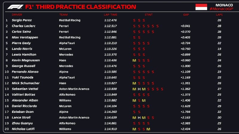 En su mejor vuelta, 'Checo' cubrió los 3.337 metros del circuito urbano de Montecarlo en un minuto, 12 segundos y 476 milésimas, sólo 41 menos que el líder del Mundial, el monegasco Charles Leclerc de Ferrari y con 370 de ventaja sobre el compañero de éste, el español Carlos Sainz, que marcó el tercero crono de la sesión.