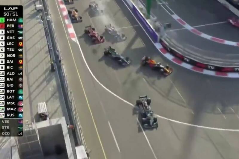 Otro accidente de Lance Stroll permitió que todos salieran desde la parrilla pero en una de las primeras curvas, Hamilton quedó fuera del circuito tras no poder doblar. Con ello, Pérez se quedó con el liderato y conquistó el Gran Premio de Azerbaiyán, su segunda victoria en la Fórmula 1 y la primera con Red Bull.