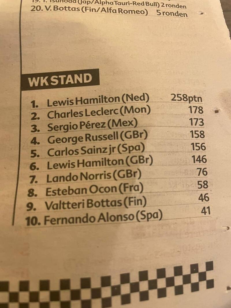 Sin embargo, a pesar del resultado, el periódico HNL de Países Bajos publicó la actual tabla del campeonato de pilotos y en primer lugar apareció el nombre de Lewis Hamilton. Con una nacionalidad diferente, la neerlandesa, el británico se encontró en la primera posición de la contienda con 258 puntos, los que en realidad tiene Max Verstappen.