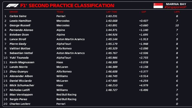 En su mejor intento, Sainz cubrió los 5.063 metros de la pista singapurense en un minuto, 42 segundos y 587 milésimas; 208 milésimas menos que Leclerc; en una sesión en la que todos marcaron sus vueltas rápidas con el neumático blando y en la que el neerlandés Max Verstappen de Red Bull, líder destacado del campeonato, firmó el cuarto crono: a 339 milésimas del talentoso piloto madrileño.