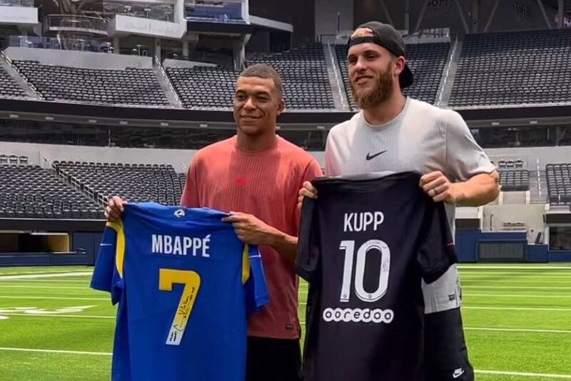 Mediante una serie de videos y fotografías, se vio cómo Mbappé estuvo pateando el ovoide desde las 20 yardas en el terreno de juego del SoFi Stadium, casa de los Rams y sede del Super Bowl LVI. El francés estuvo acompañado de Kupp y otros jugadores, además intercambió una camiseta del PSG por una de los campeones del futbol americano.