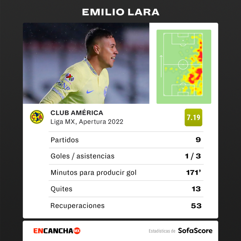 Emilio Lara ha disputado nueve jornadas con el América en este Apertura 2022, donde los datos que nos comparte SofaScore nos señalan que tiene una clasificación global de 7.1 en promedio por todos sus encuentros, donde ha marcado un gol y dado 3 asistencias.