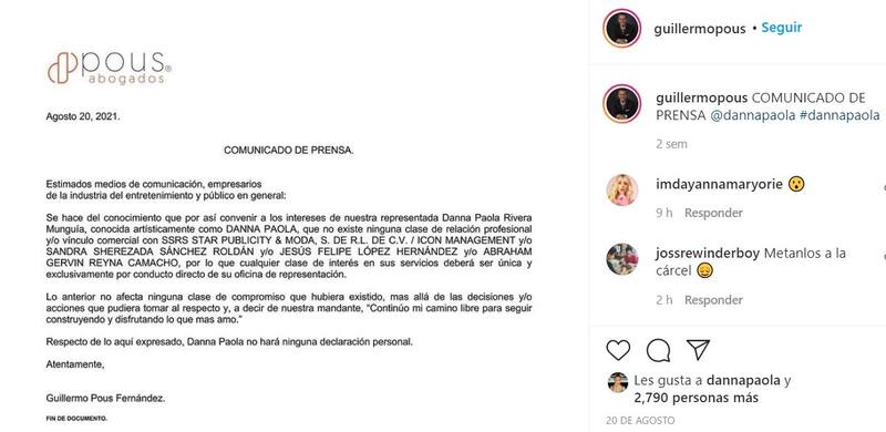 A causa de esto, el pasado 20 de agosto, el abogado Guillermo Pous compartió en su cuenta oficial de Instagram un comunicado en el que informó sobre el cambio de representación de la artista mexicana Danna Paola y el término de su relación laboral con las empresas demandadas.