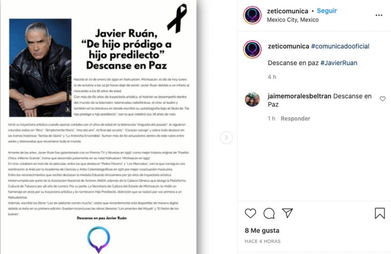 El actor Javier Ruán, conocido por su trabajo en telenovelas como "Rina", el remake de "Simplemente María", "Ana del aire", Al final del arcoíris", "Corazón salvaje", "María la del Barrio" y las históricas "Senda de gloria" y "La antorcha encendida", falleció este 11 de octubre debido a un infarto al miocardio.