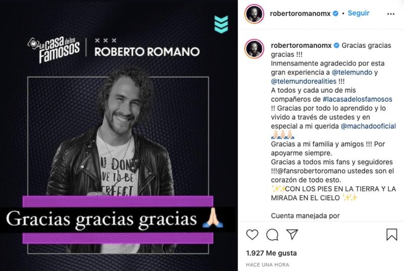 "Inmensamente agradecido por esta gran experiencia a @telemundo y @telemundorealities !!! A todos y cada uno de mis compañeros de #lacasadelosfamosos !! Gracias por todo lo aprendido y lo vivido a través de ustedes y en especial a mi querida @machadooficial".