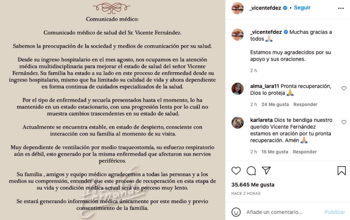 En el reporte médico sobre la salud de Vicente Fernández, quien se ha mantenido hospitalizado desde el pasado 9 de agosto, después de una caída que sufrió en su rancho Los Tres Potrillos, dado a conocer la tarde de este 11 de octubre a través de las cuentas oficiales en Instagram de Vicente Fernández y Vicente Fernández Jr., se dice que la enfermedad de don Vicente, desde su ingreso hospitalario, "ha limitado su calidad de vida y ahora dependiente en forma continua de cuidados especializados de salud".