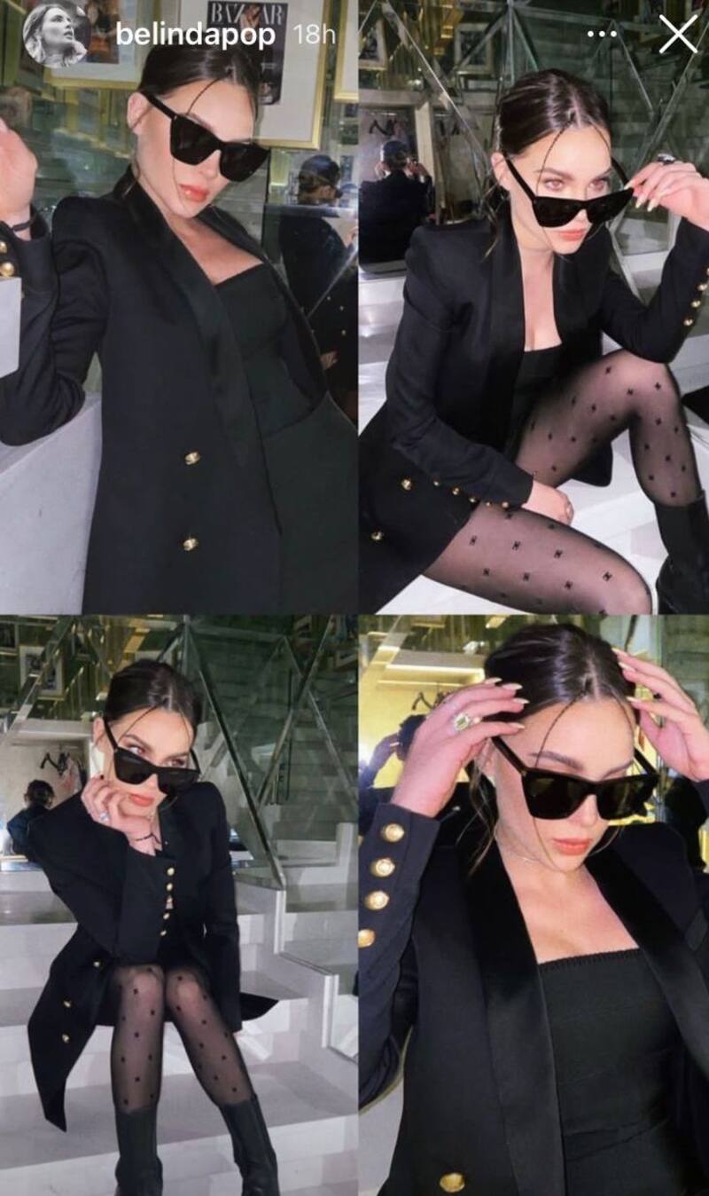Para la ocasión, Belinda lució un total black look, conformado por un famoso little black dress con un maxiblazer, con detalles dorados, así como un par de medias de la firma Chanel, que acompañó con unas misteriosas gafas negras.