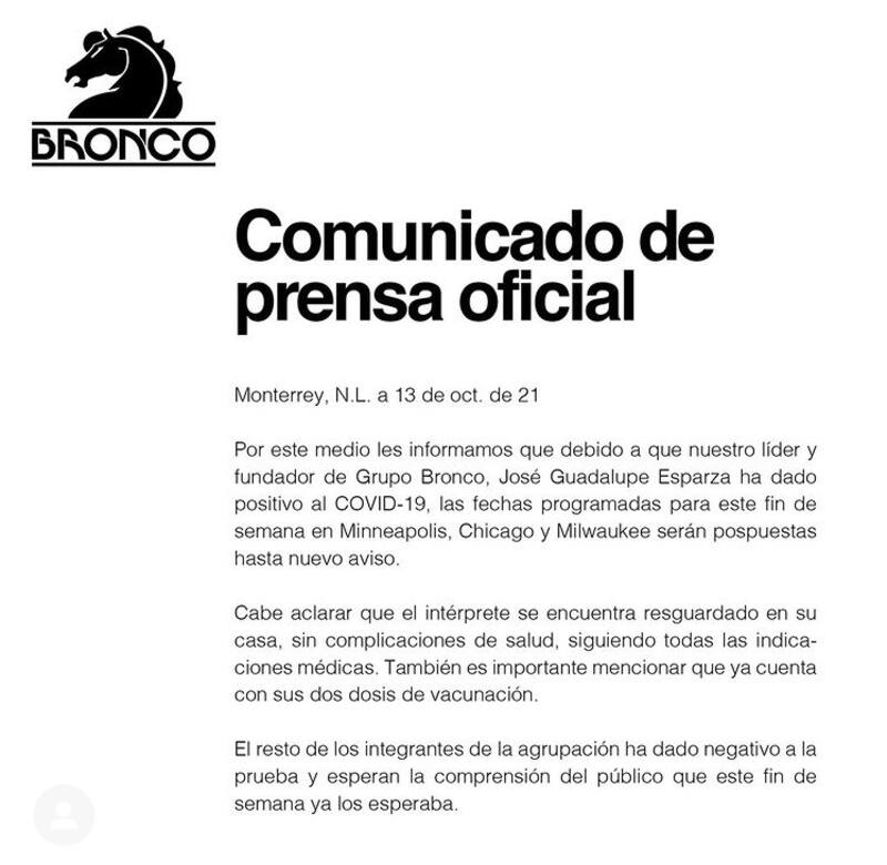 El vocalista de Bronco, Lupe Esparza, suspendió la serie de conciertos que la agrupación tenía programados para este fin de semana en Estados Unidos debido a que dio positivo a la prueba de covid-19, por lo que las fechas se repondrán hasta nuevo aviso.