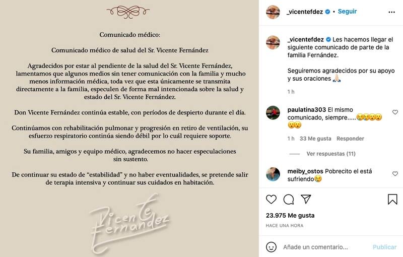 En el reporte médico se aludió al hecho. "Lamentamos que algunos medios sin tener comunicación con la familia y mucho menos información médica, toda vez que esta únicamente se transmita directamente a la familia, especulen de forma mal intencionada sobre la salud y estado del Sr. Vicente Fernández".
