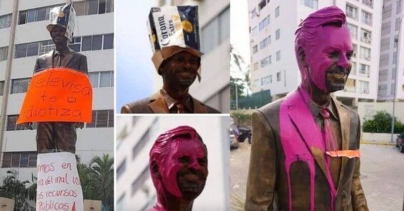 Además de echarle pintura, la estatua fue decorada con basura y letreros de repudio a la televisora que lo vio despuntar su carrera.