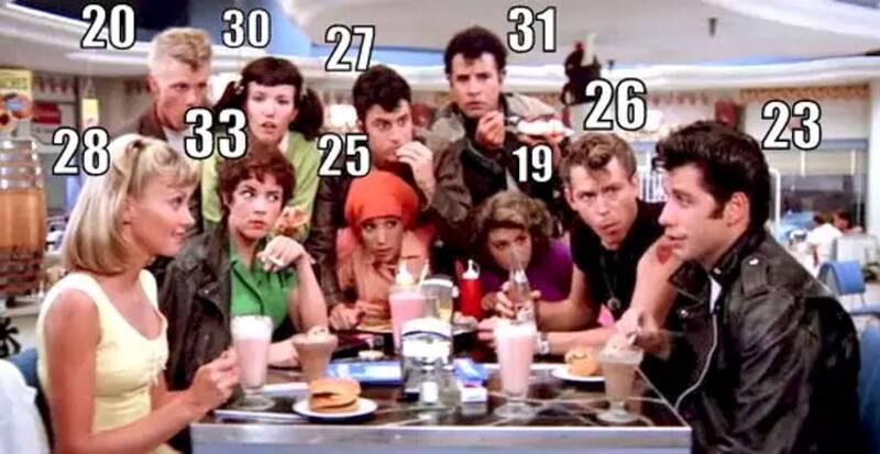 La mayoría de los actores eran demasiados mayores a la edad estipulada en preparatoria. Olivia Newton-John sumaba 28 años, mientras que John Travolta tenía 23. El resto ya rondaba en los 30 años.